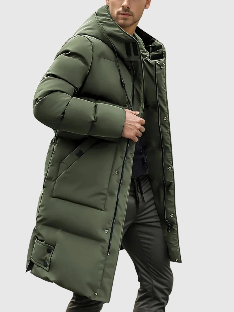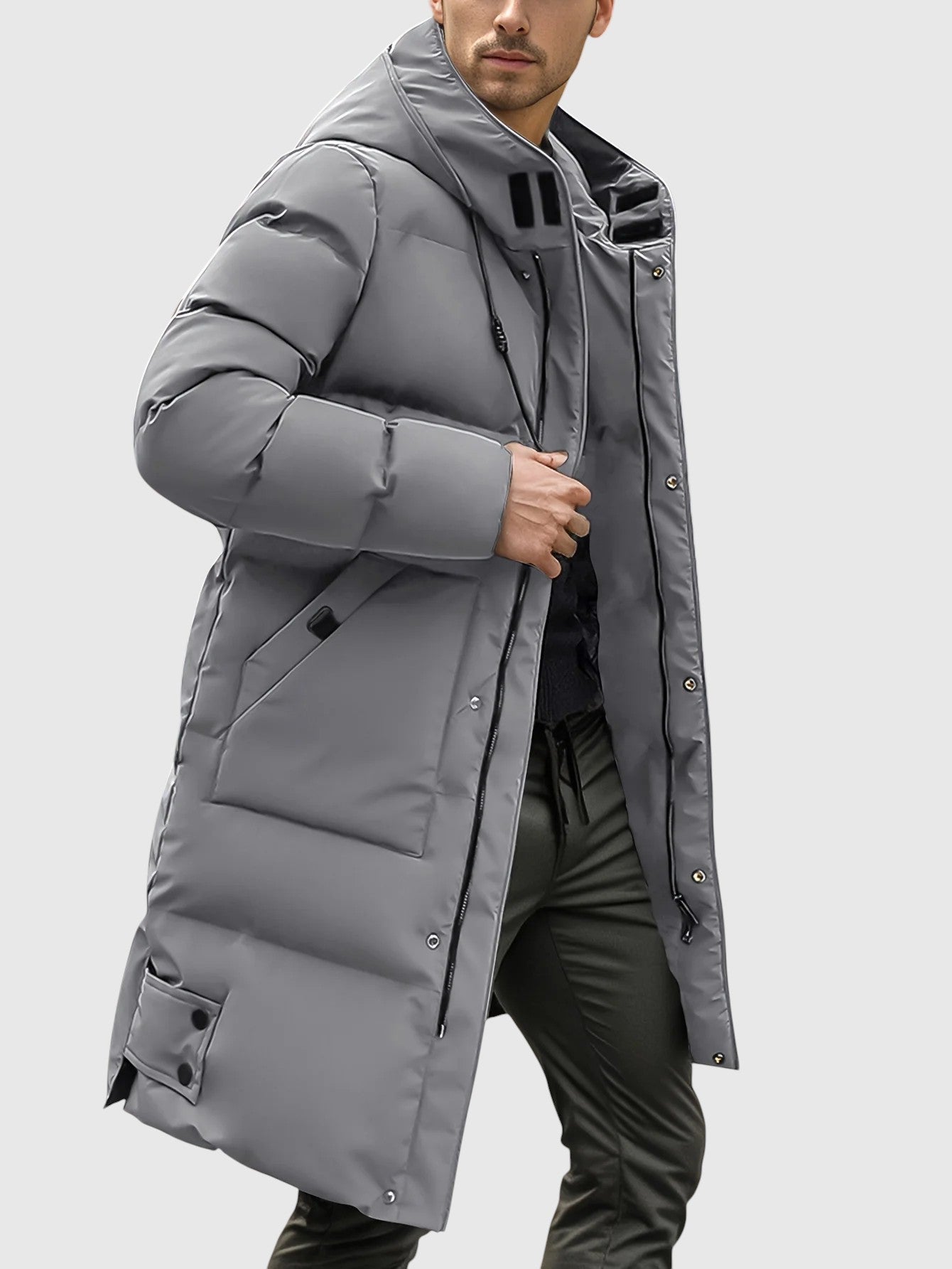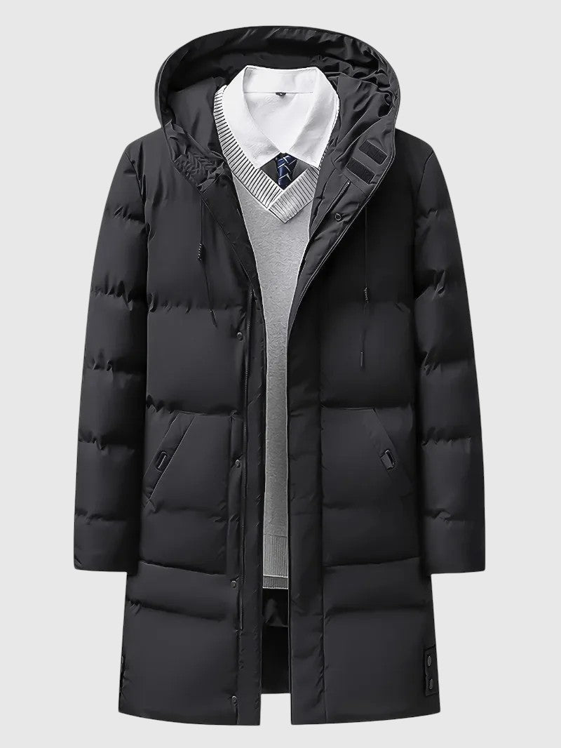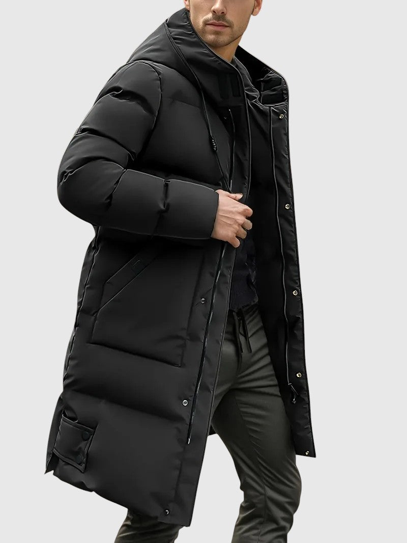 Dolga jakna z modernim krojem, zasnovana za zagotavljanje maksimalne zaščite in udobja v hladnih dneh. Podložitev zagotavlja učinkovito izolacijo, medtem ko kapuca in visok ovratnik povečujeta zaščito pred vetrom in nizkimi temperaturami. Funkcionalne žepe in gumbno zapiranje dodajajo praktičnost elegantnemu dizajnu, kar ta kos naredi vsestranskega za mestno življenje in prosti čas.