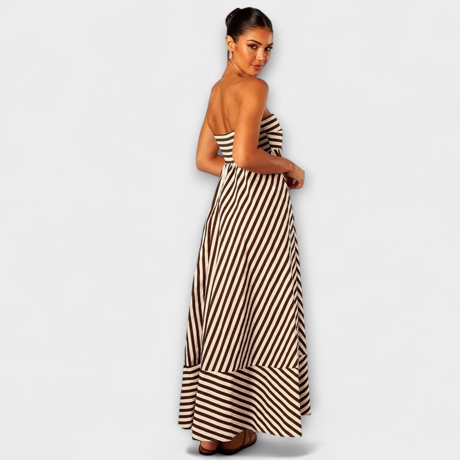 Prevzemite eleganco in gibanje z maxi obleko Nocturnal Charm z volani. Oblikovana za udobje in stil, detajl z volani na hrbtu poudari vaš videz, medtem ko stranski nevidni zadrga zagotavlja varno nošenje.