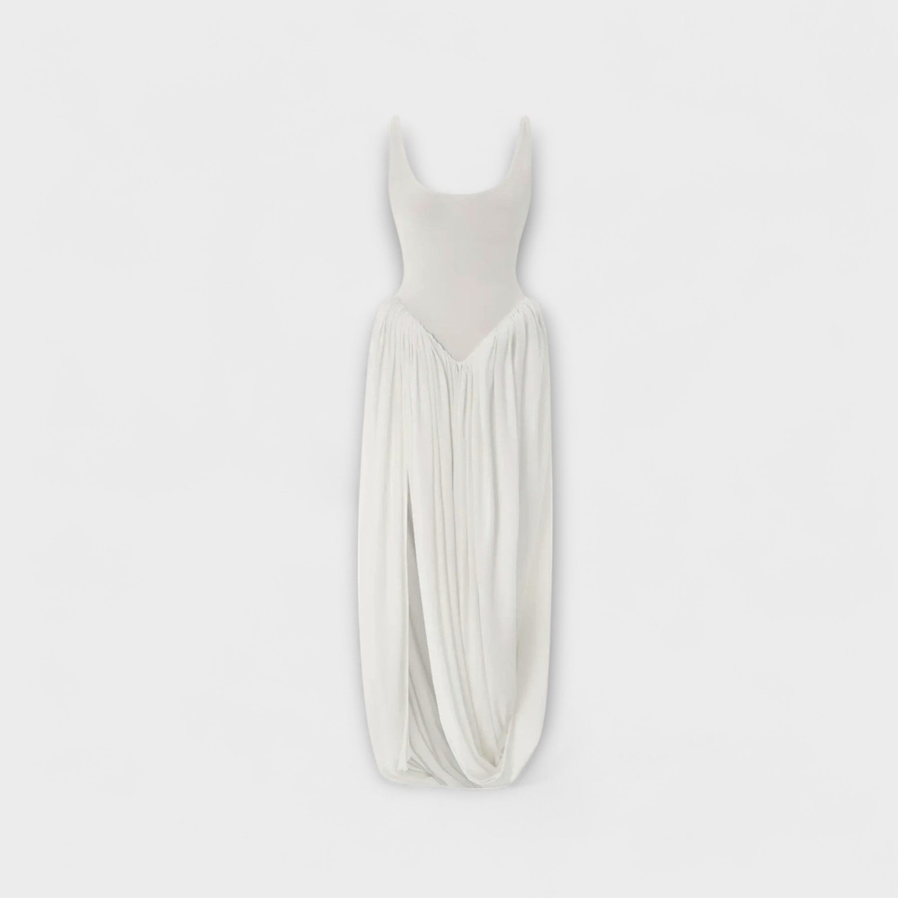 Odkrijte naše bele drapirane maxi obleke, ki imajo skulpturalno krilo in stranski razporek.