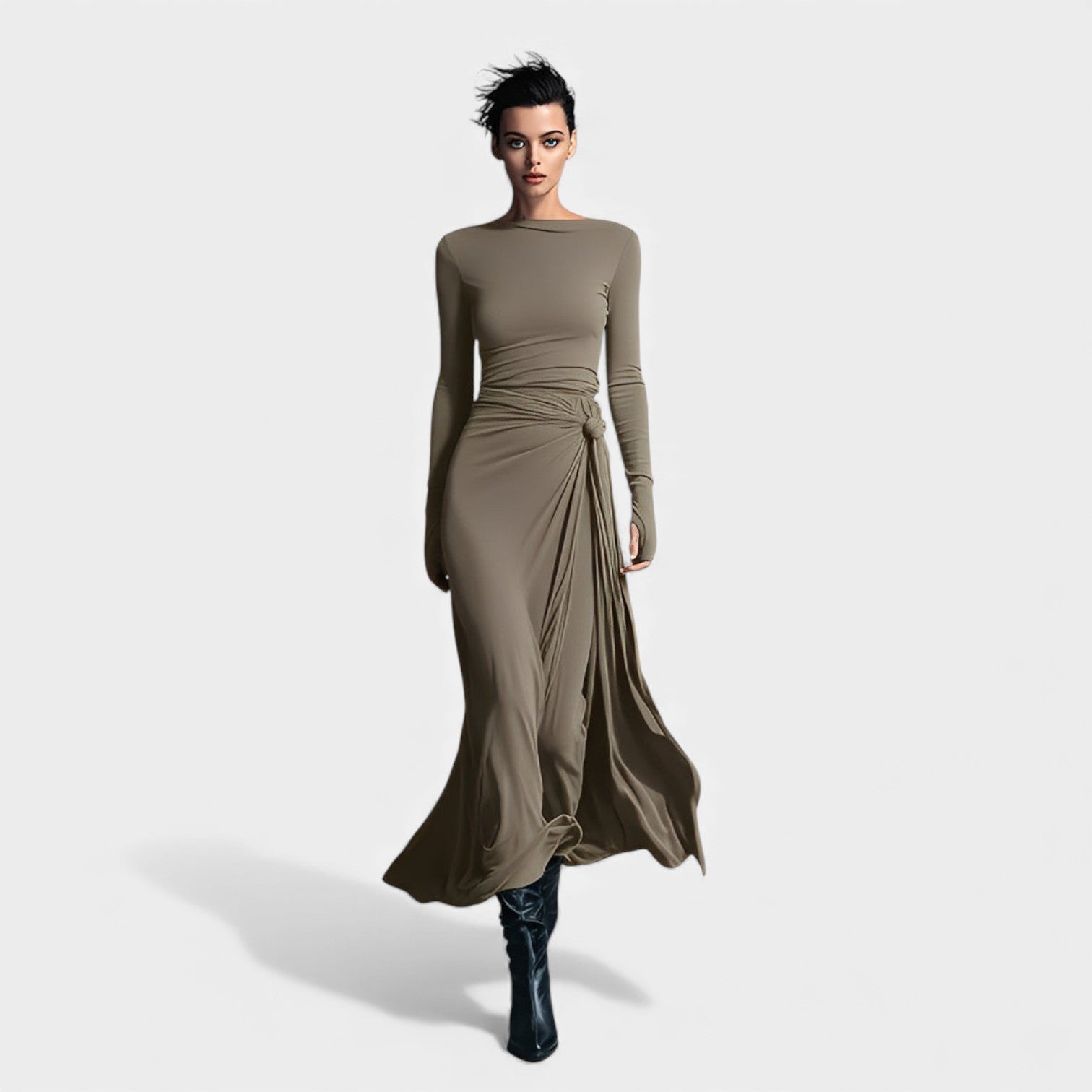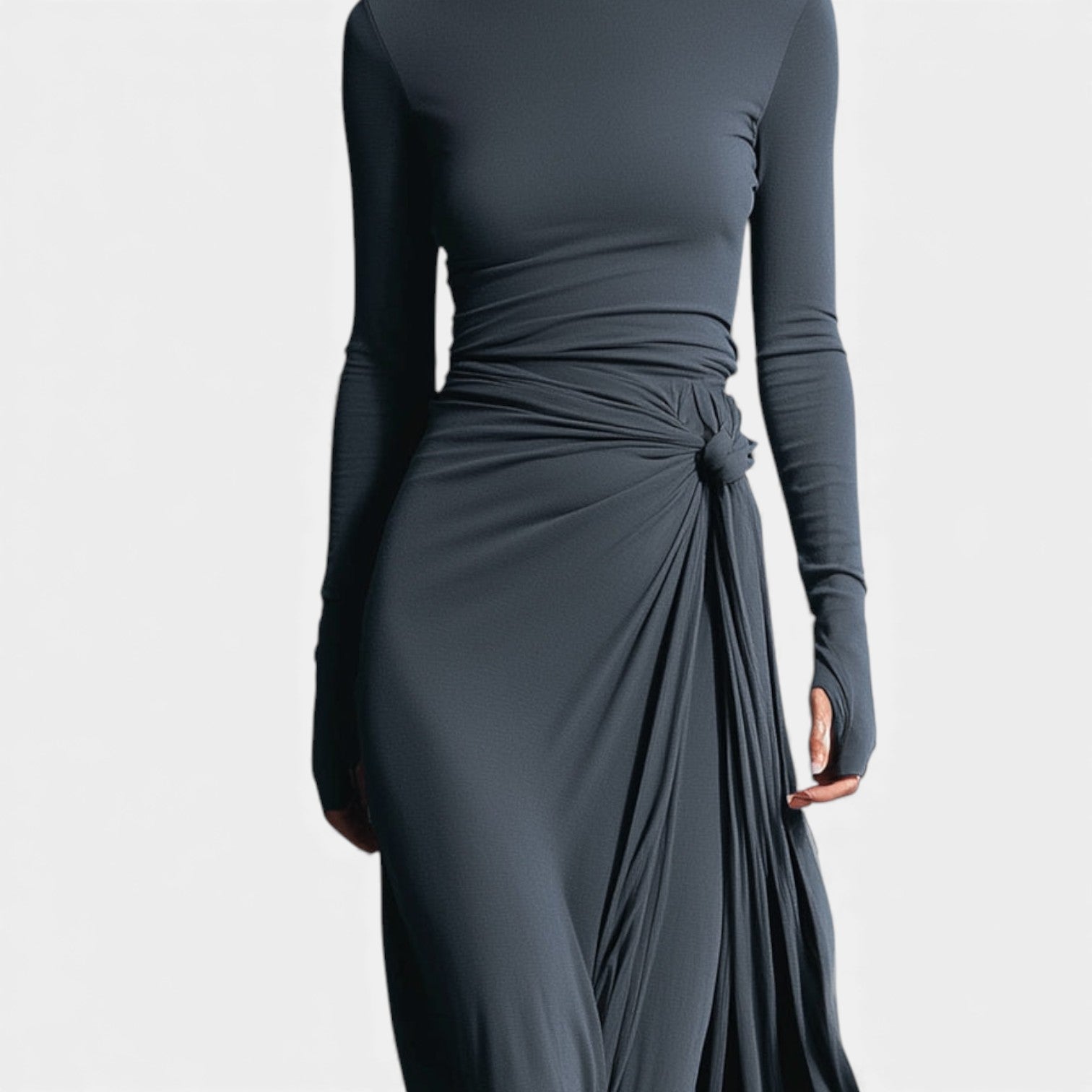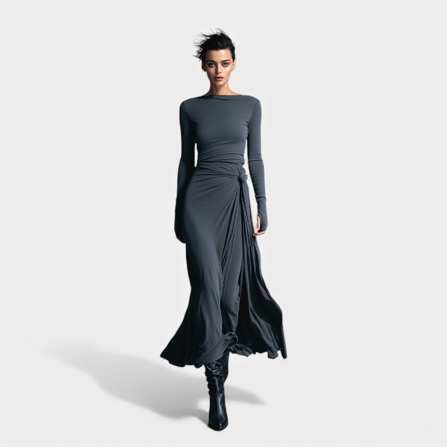 Obleka Anna je zasnovana za ženske, ki ljubijo kombinacijo klase, udobja in kroja, ki nežno oblikuje silhueto. Mehka, elastična tkanina prijetno ovije telo, medtem ko stransko vozlo z blagimi naborki ustvarja vizualni učinek podaljšanja — popolno za praznične srečanja, zimske proslave in vse trenutke, ko želite izgledati posebej prefinjeno in samozavestno. Njen lahek sijaj in brezčasna siva barva jo delata kos, ki se mu boste vračali celo sezono.