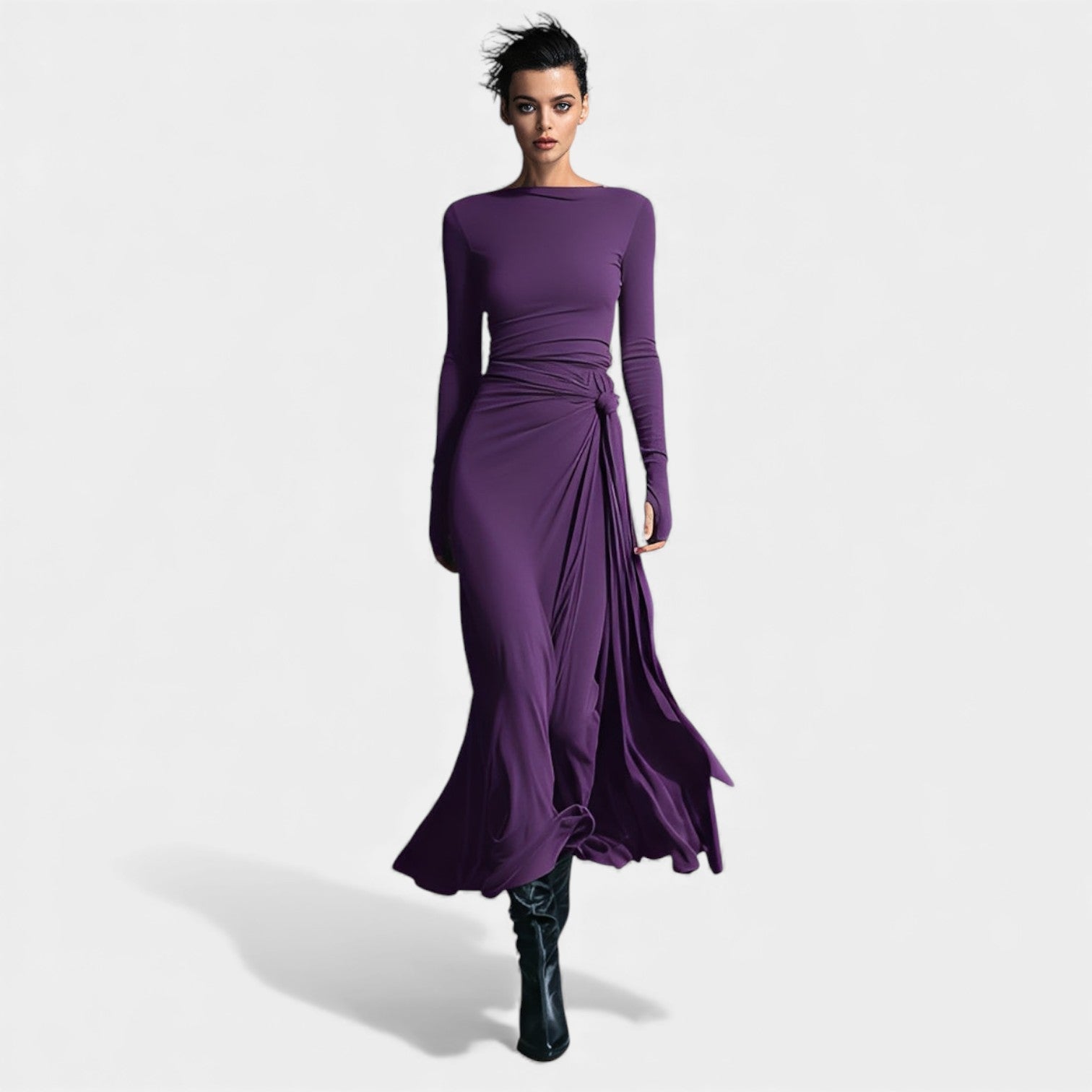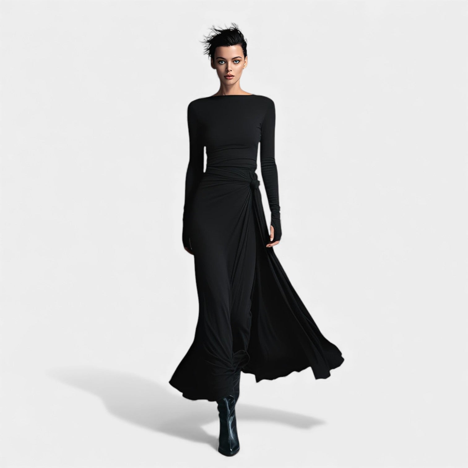 Anna – Elegantna obleka s stranskim vozlom in subtilnim sijajem