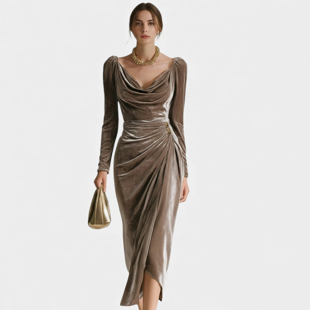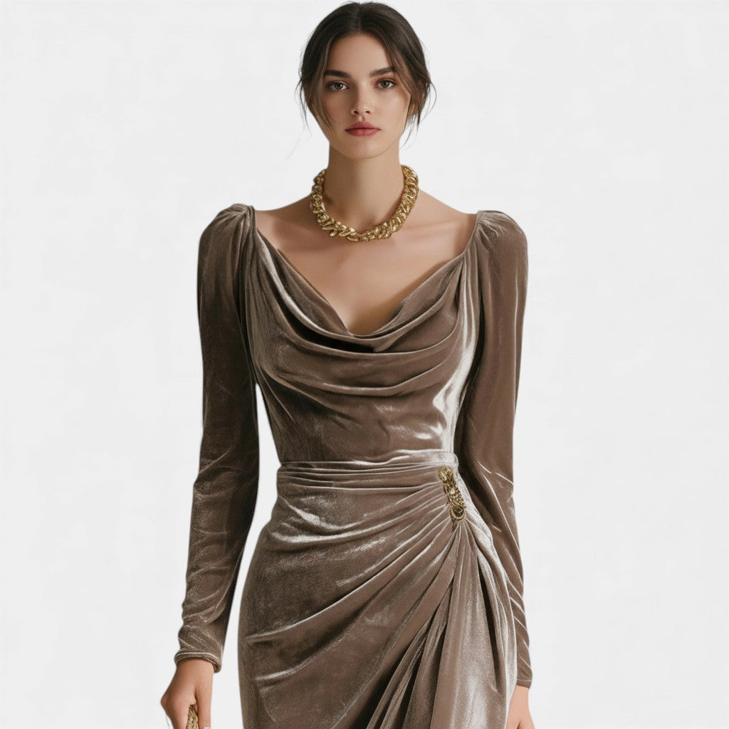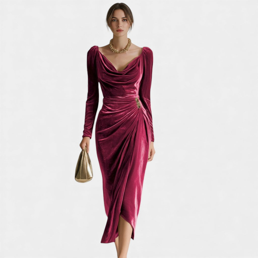 Obleka Ivona združuje luksuzno barvno teksturo, prefinjen drapiran dekolte in prilagojen kroj, ki nežno poudarja obline. Oviti spodnji del z blagimi naborki vizualno podaljšuje linijo telesa, medtem ko okrasni gumb v pasu doda odmerjeno mero glamurja in izpostavi najlepši del silhuete. Idealna je za večerne izhode, svečane trenutke in vse priložnosti, ko želiš izgledati elegantno in samozavestno.