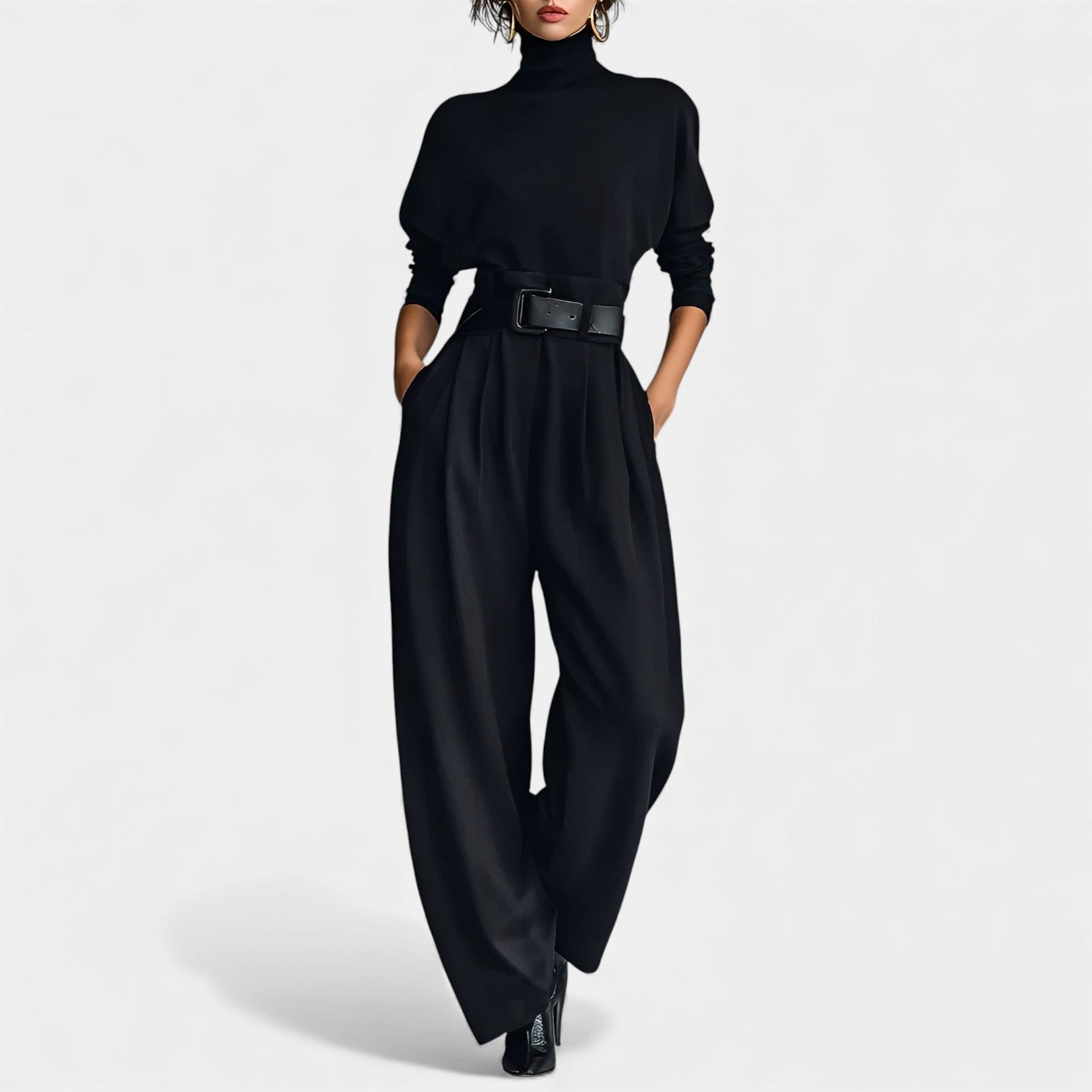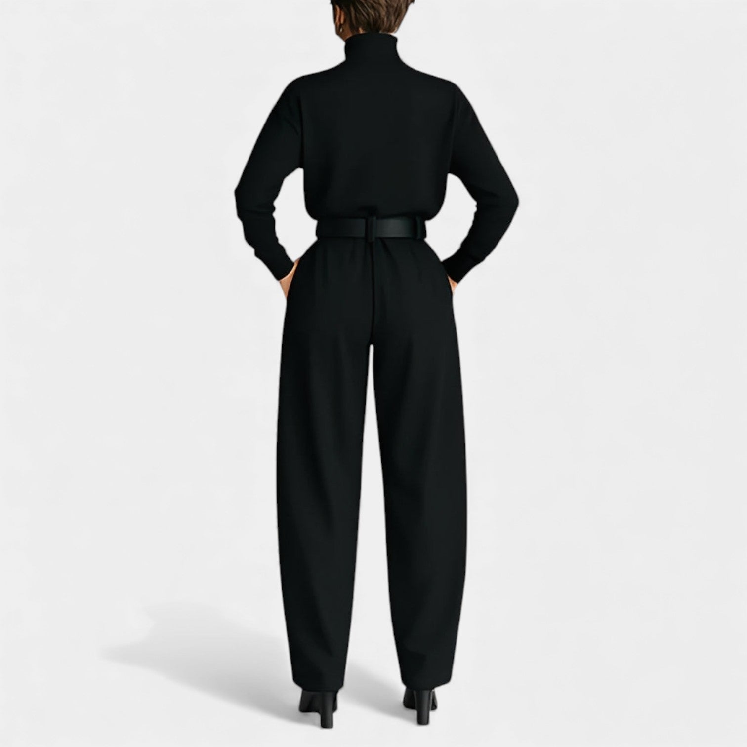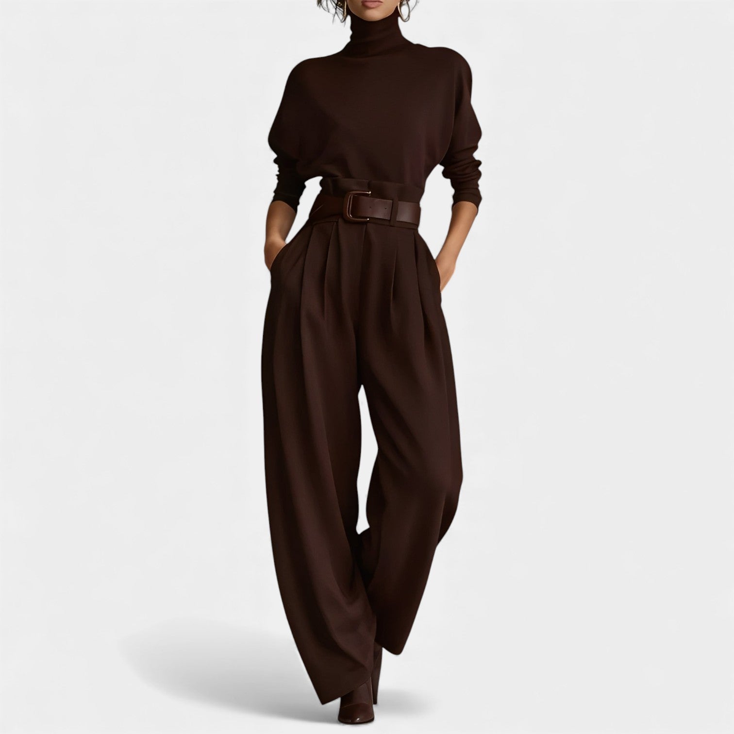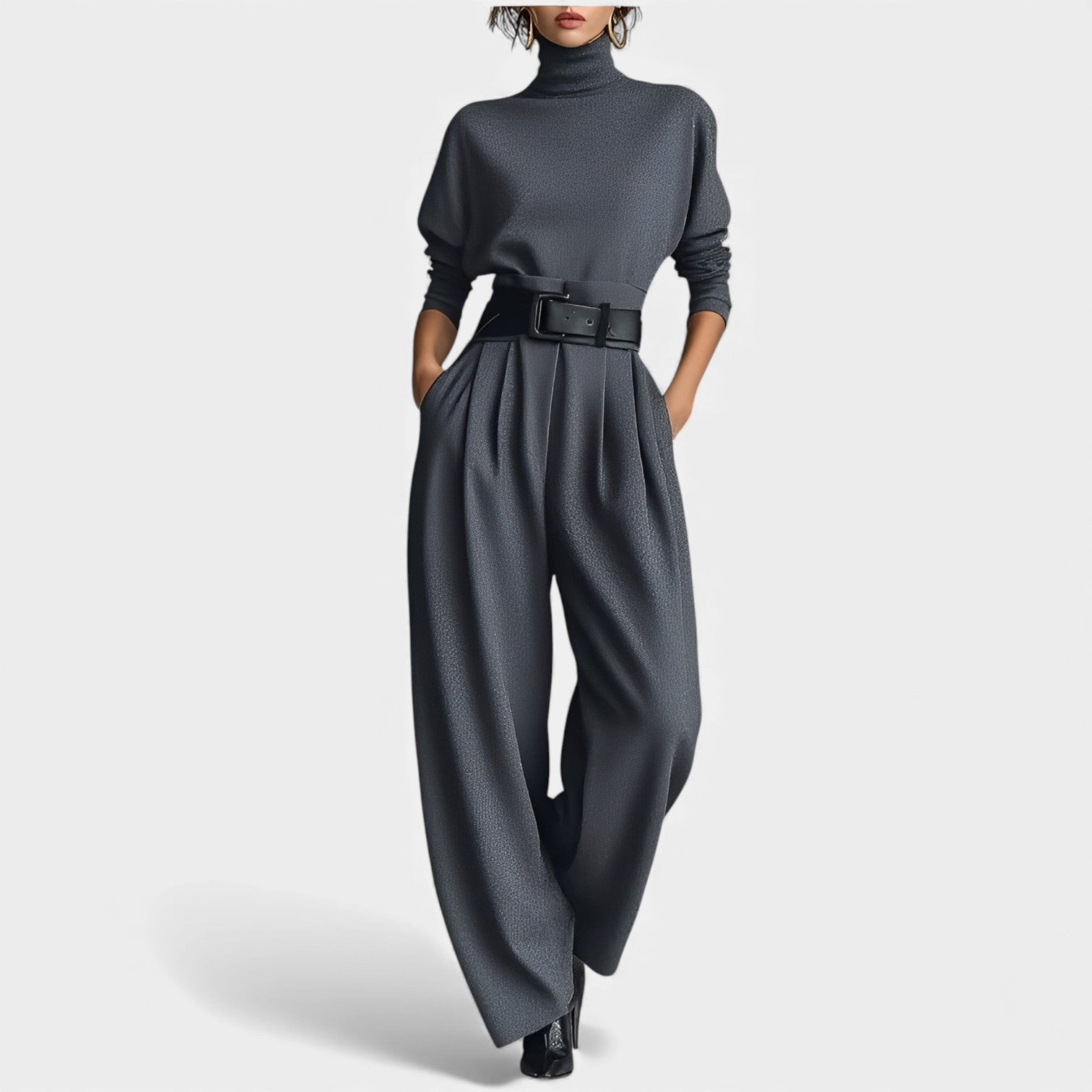 Komplet Maria združuje moderno, čisto sofisticiranost z udobnostjo za vsak dan. Minimalistična majica z rolko in hlače ravnega kroja skupaj ustvarjajo podaljšano silhueto in nudijo sproščen, a eleganten videz. Idealno je za delo, mestne sprehode ali večerne trenutke, ko želite izgledati urejeno brez truda.
