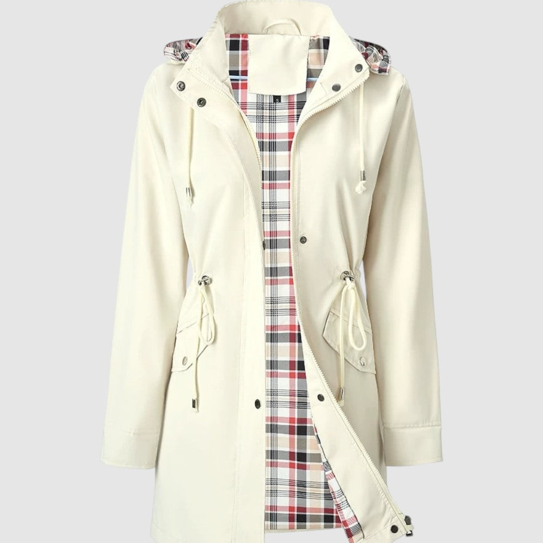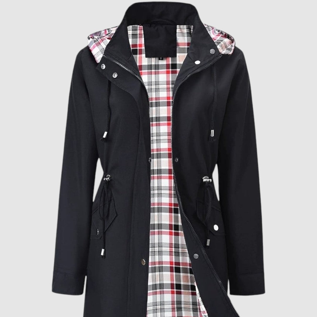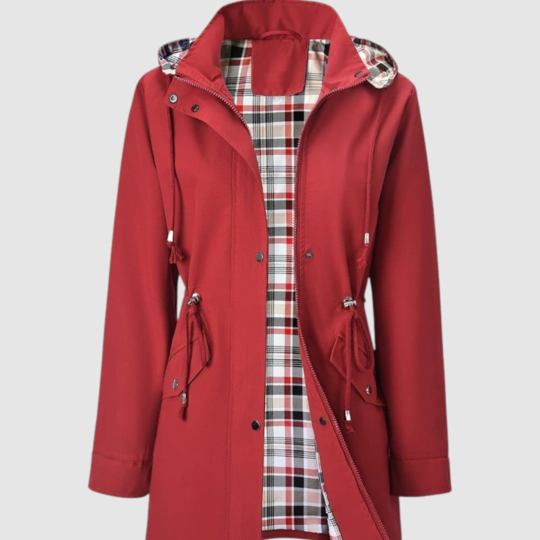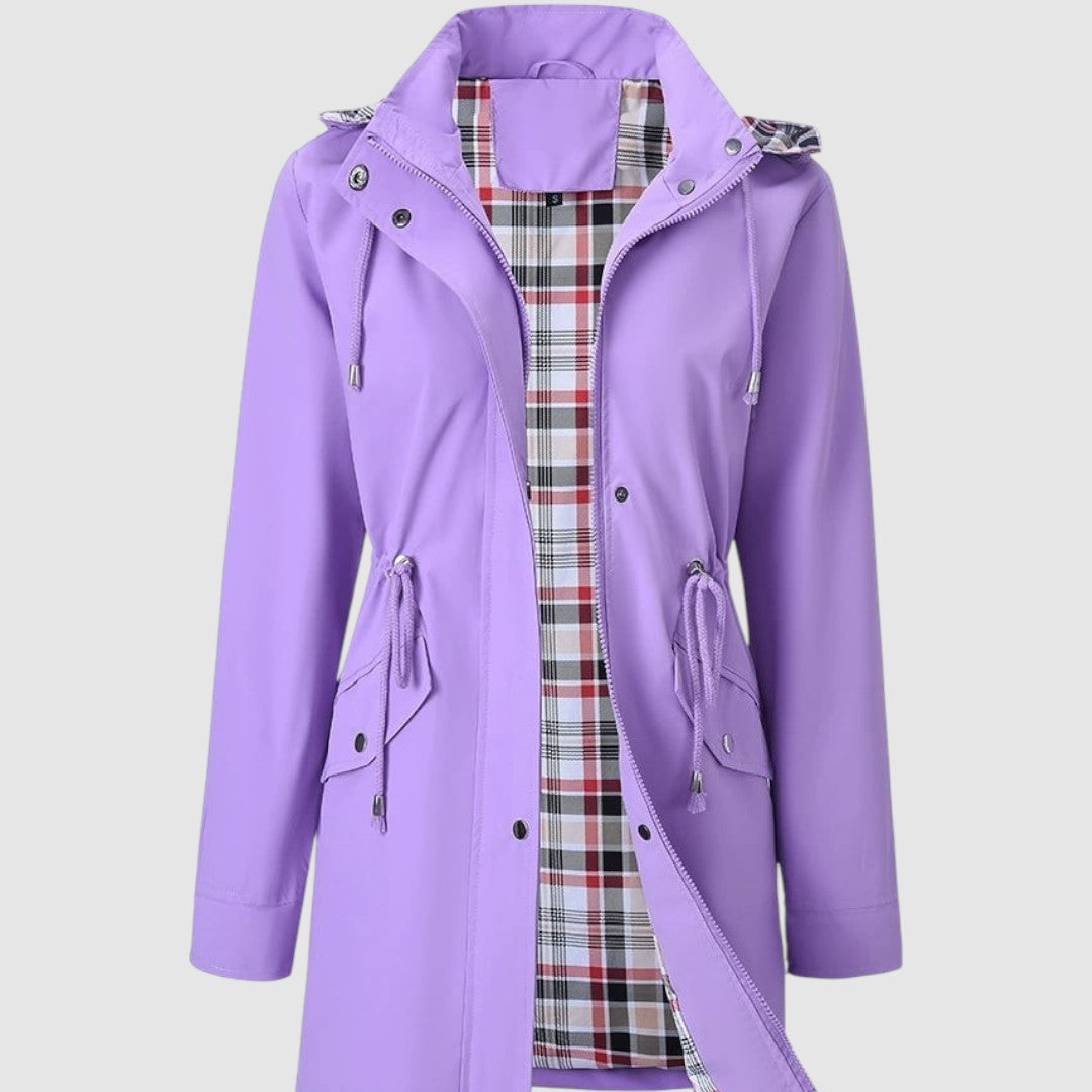 Ta plašč je idealna izbira za deževne in vetrovne dni. Zaradi nepremočljivega materiala vas zanesljivo ščiti pred neprijetnim vremenom, medtem ko praktična kapuca in zategnjen pas dodajata funkcionalnost in ženskost. Notranja podloga s karirastim vzorcem zagotavlja udobje in izviren slog.