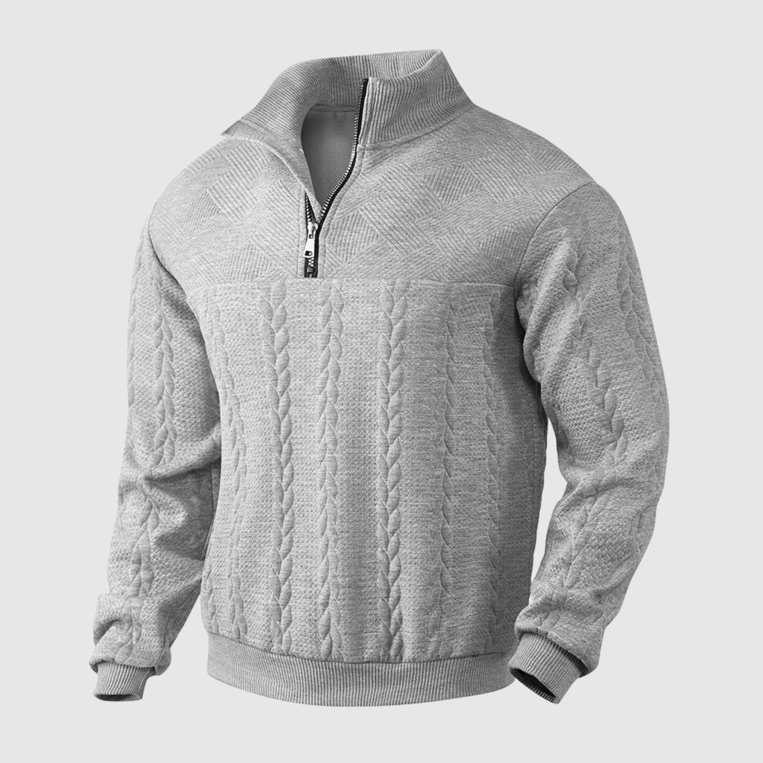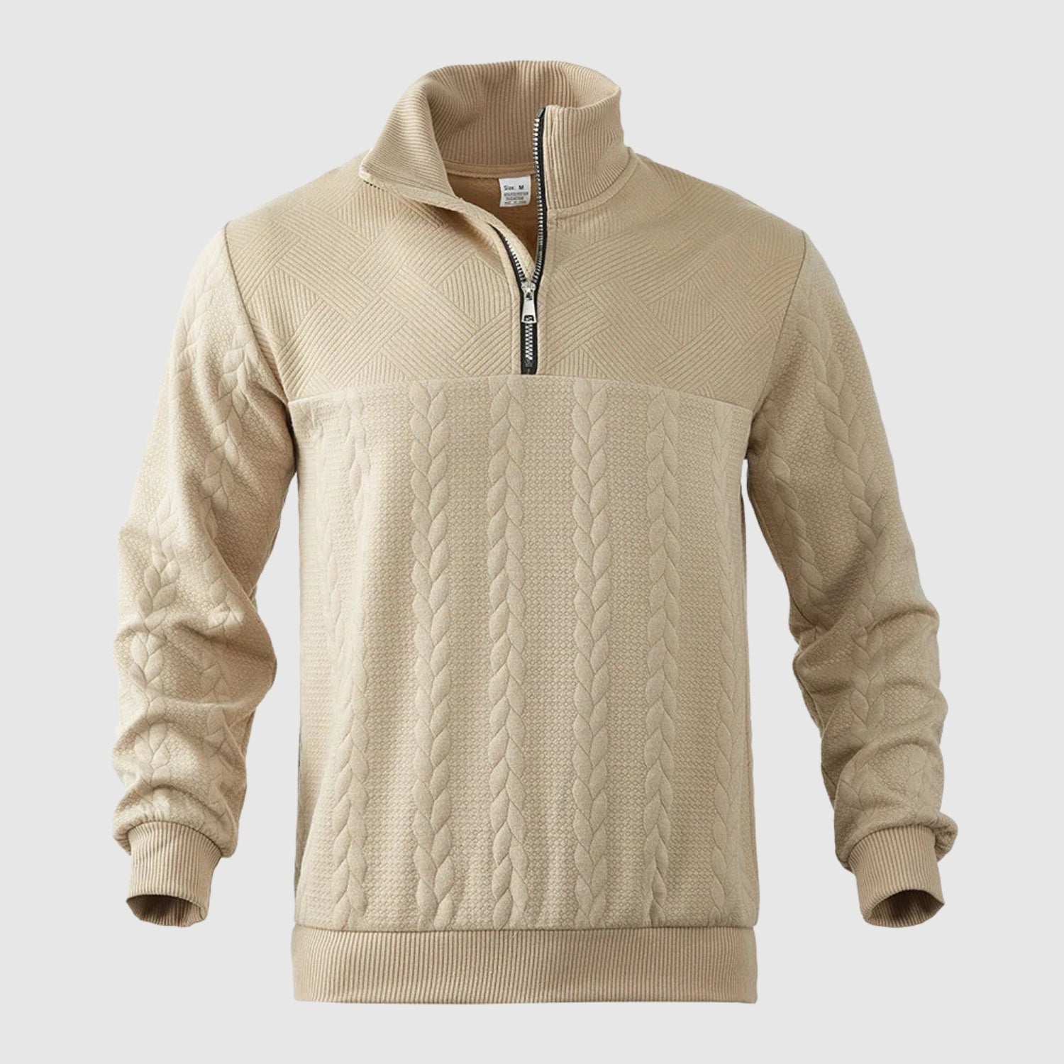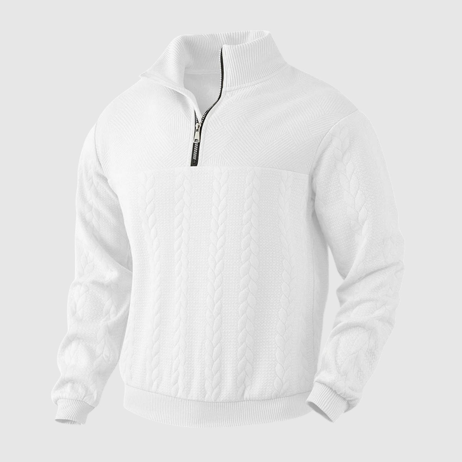 Ta pleten pulover z zadrgo na četrtinski dolžini je popolna kombinacija sofisticiranega sloga in vsakodnevnega udobja. Zaradi mehkega materiala in strukturiranega dizajna je ta pulover zelo univerzalen: idealen za delo, vsakodnevno nošenje ali za bolj eleganten videz v hladnem vremenu. Nežni detajli, maksimalna impresivnost.