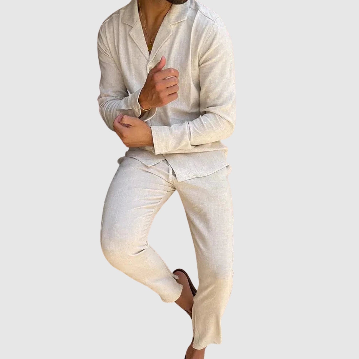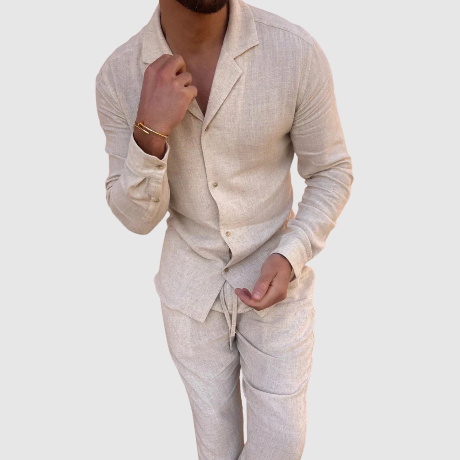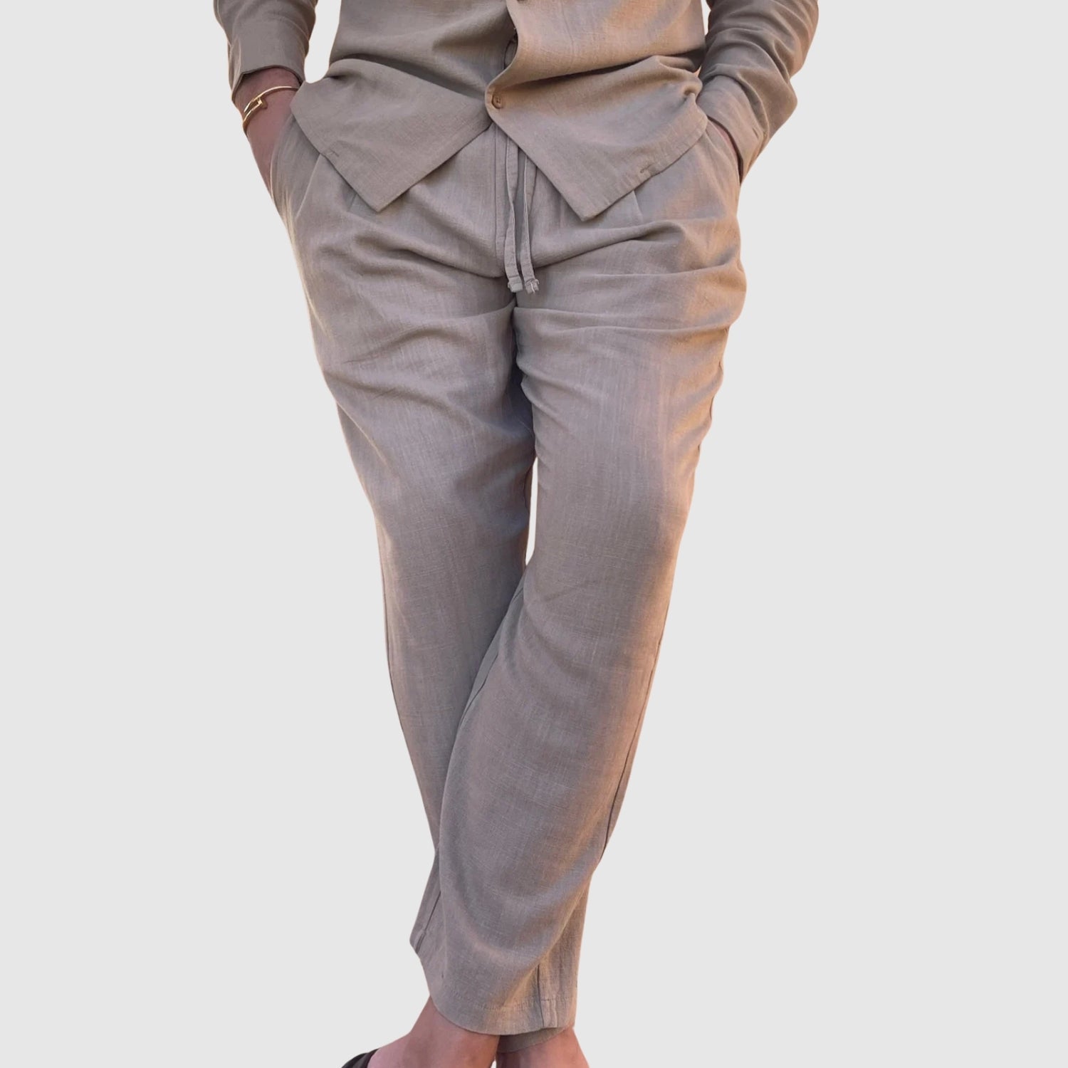 Ta laneni komplet ponuja popolno kombinacijo udobja in sloga. Njegova lahka in zračna tkanina vas bo ohranila udobne skozi ves dan, medtem ko njegov sofisticiran dizajn omogoča, da izgledate brezhibno ob vsaki priložnosti, od neformalnih srečanj do posebnih dogodkov.