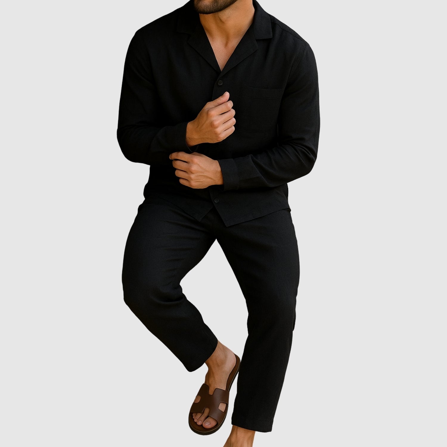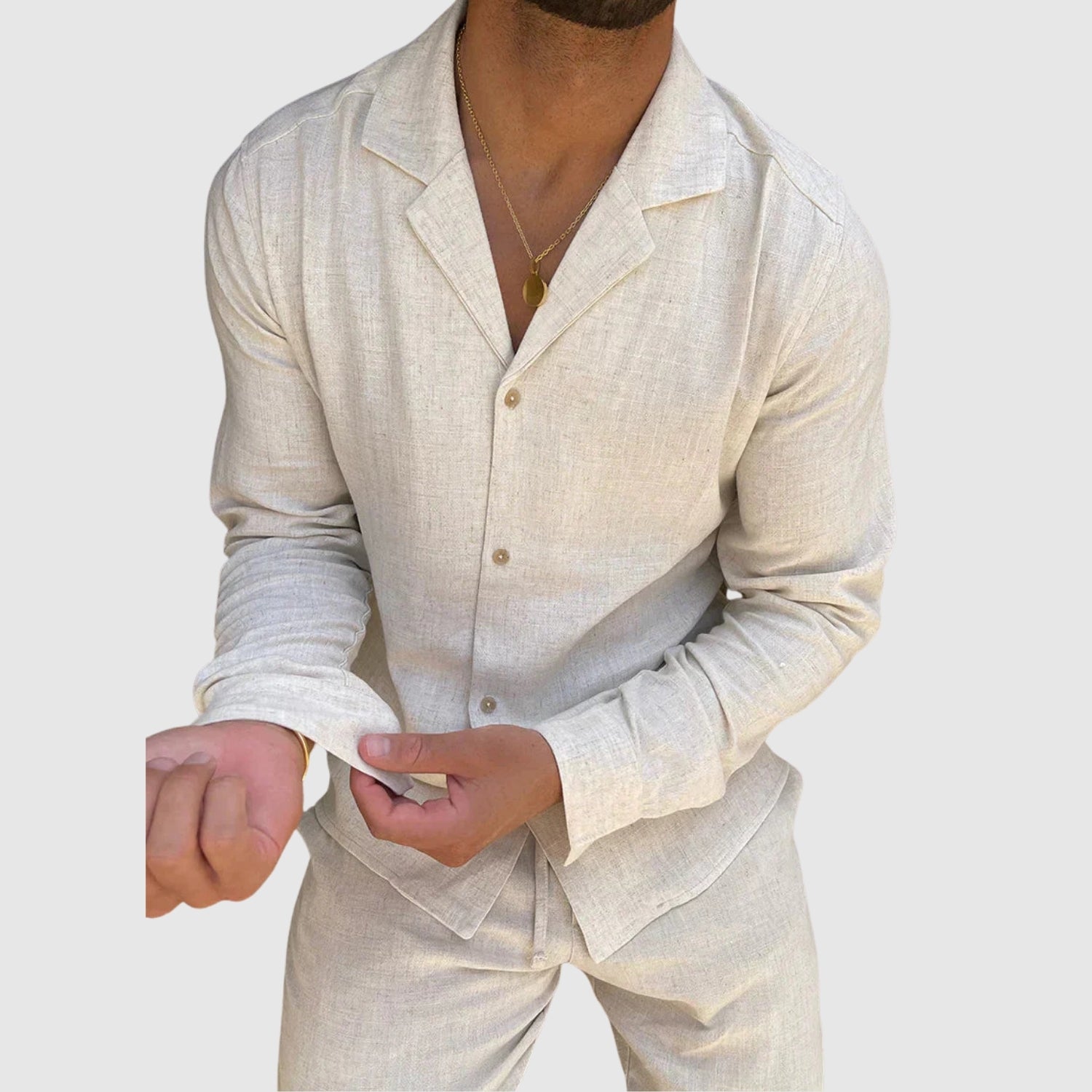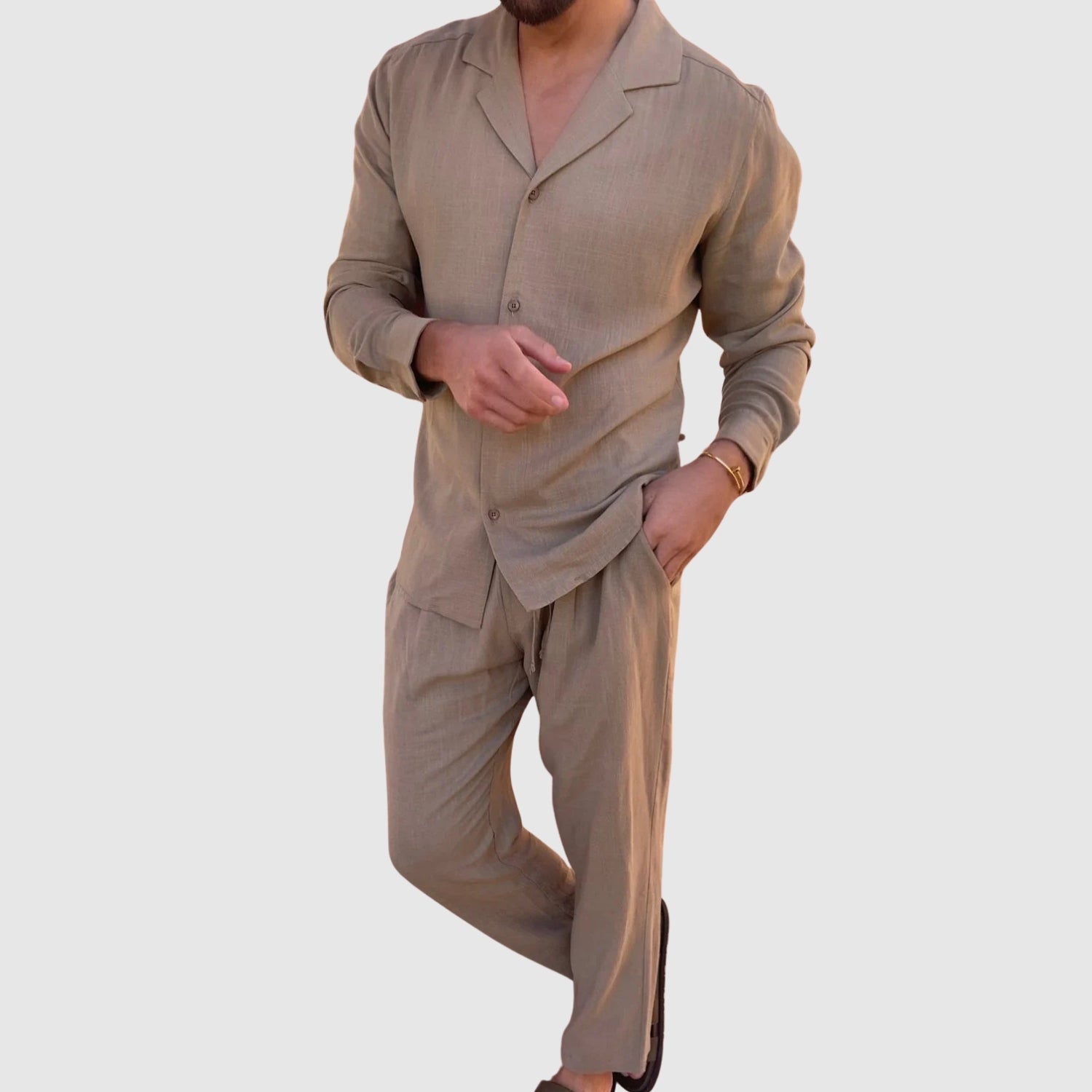 Ta laneni komplet ponuja popolno kombinacijo udobja in sloga. Njegova lahka in zračna tkanina vas bo ohranila udobne skozi ves dan, medtem ko njegov sofisticiran dizajn omogoča, da izgledate brezhibno ob vsaki priložnosti, od neformalnih srečanj do posebnih dogodkov.