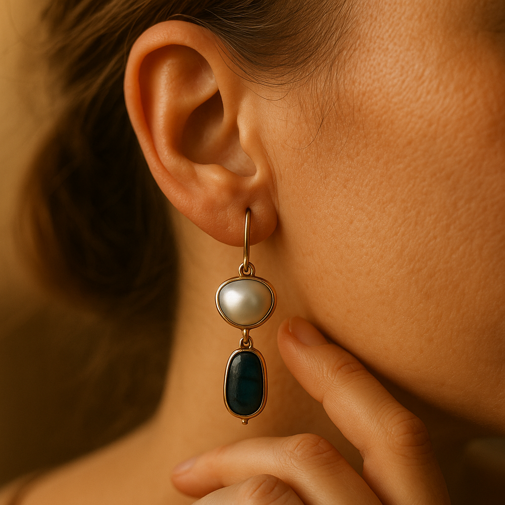 Globoko moder kamen spominja na morje ob sončnem zahodu, medtem ko naravna biserna doda nežen, mesečni sijaj. Ta kombinacija vzbuja milino preteklih časov in vašemu videzu daje avtentičen pridih.